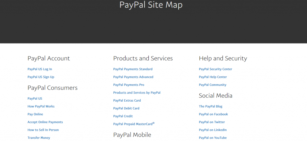 The design of PayPal’s sitemap has numerous links, which might sound a bit complex, but it is not. It provides ease of navigation as everything a user would need is present in the sitemap’s links.